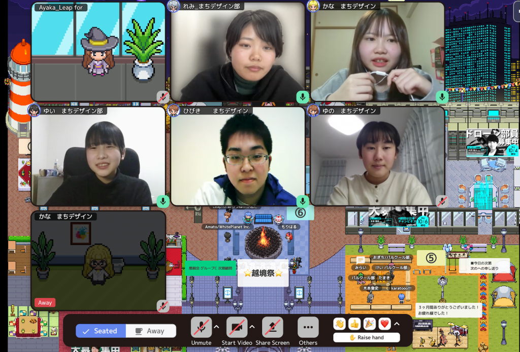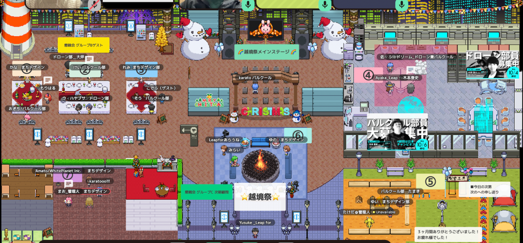 活動の締めくくりとして、*メタライフ上で「越境祭」を開催し、各部が3ヶ月の成果を発表しました。ドローン部はプレゼン形式、まちデザイン部はブース形式、パルクール研究部はオリジナルの動画を披露し、オンライン上で参加者と共に盛り上がりました。