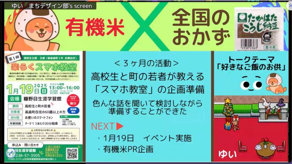 ② まちデザイン部 センパイ顧問:岡山県白石島で町おこしに取り組む地域活性化の実践者 活動内容:部員それぞれが自身の住んでいる地域課題に取り組み、計画から実行までセンパイ顧問に伴奏してもらいながら形にしていきました。