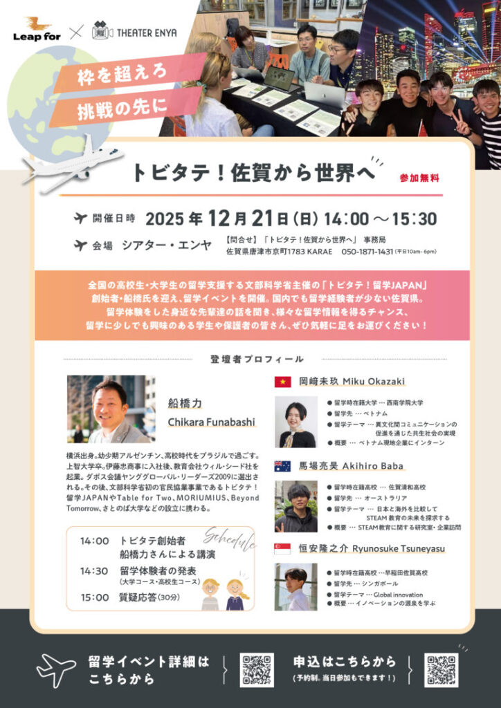 佐賀県唐津市の映画館シアター・エンヤにて、12月21日(日)に、地方の留学推進支援イベント「佐賀からトビタテ!世界へ」を開催いたします。